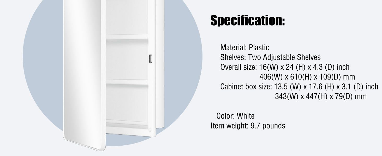 Overall Size: 16 x24 x4.2 inch , 406 x610 x106mm Rough in: 13.5 x17.5 x3.2 inch , 343 x445 x72mm Adjusted shelves: 2pcs Product Features: