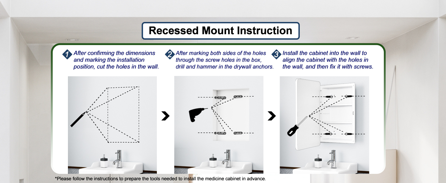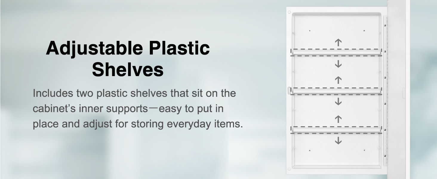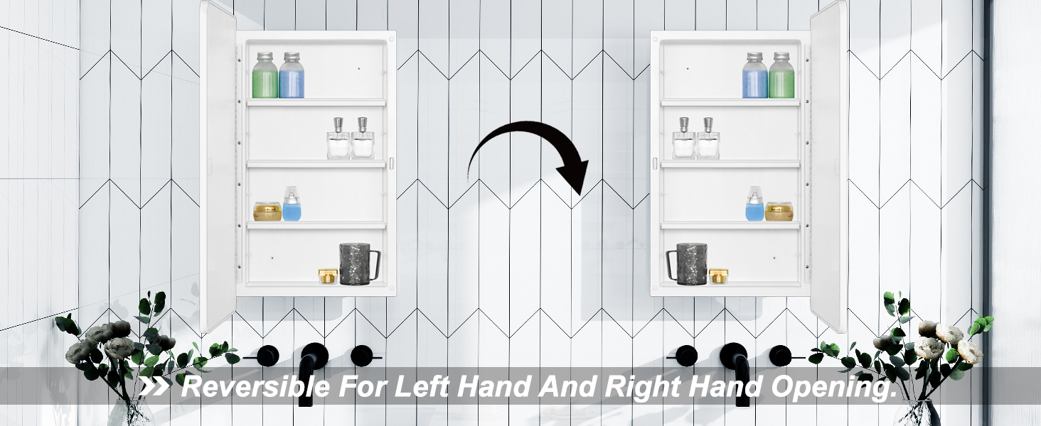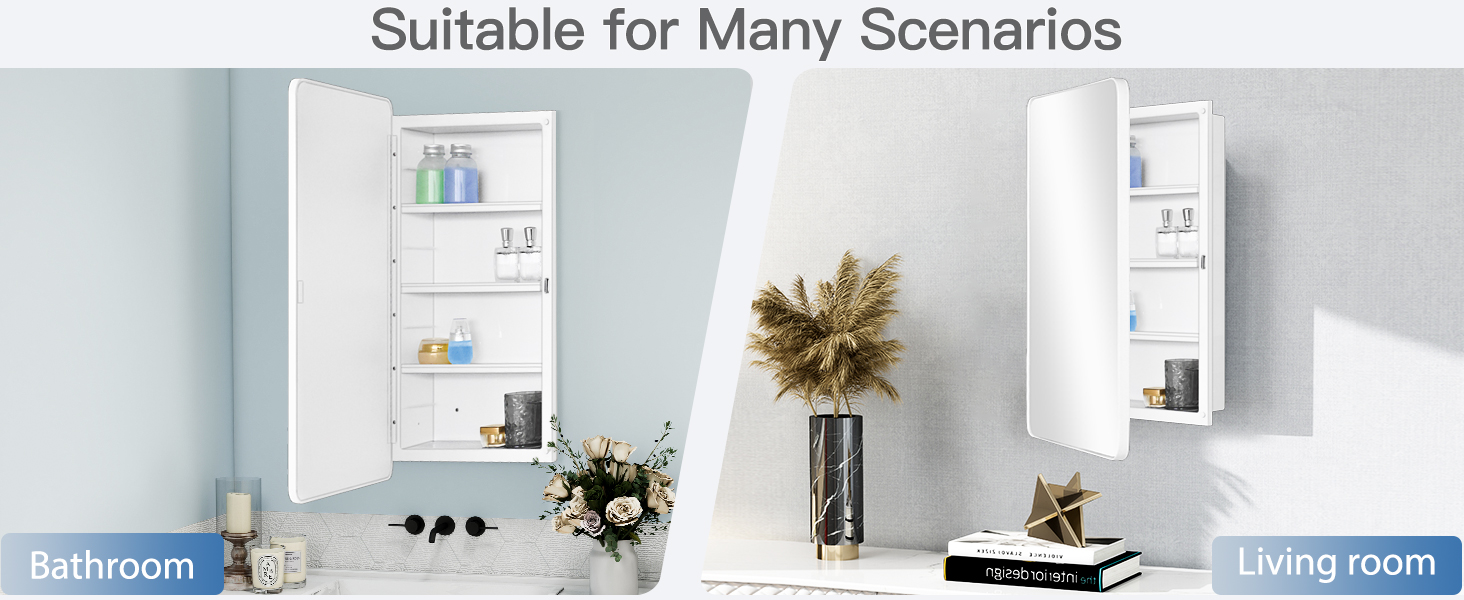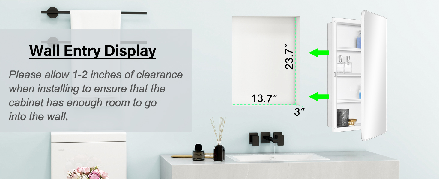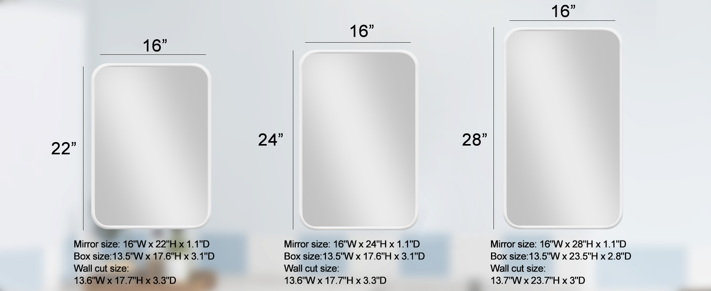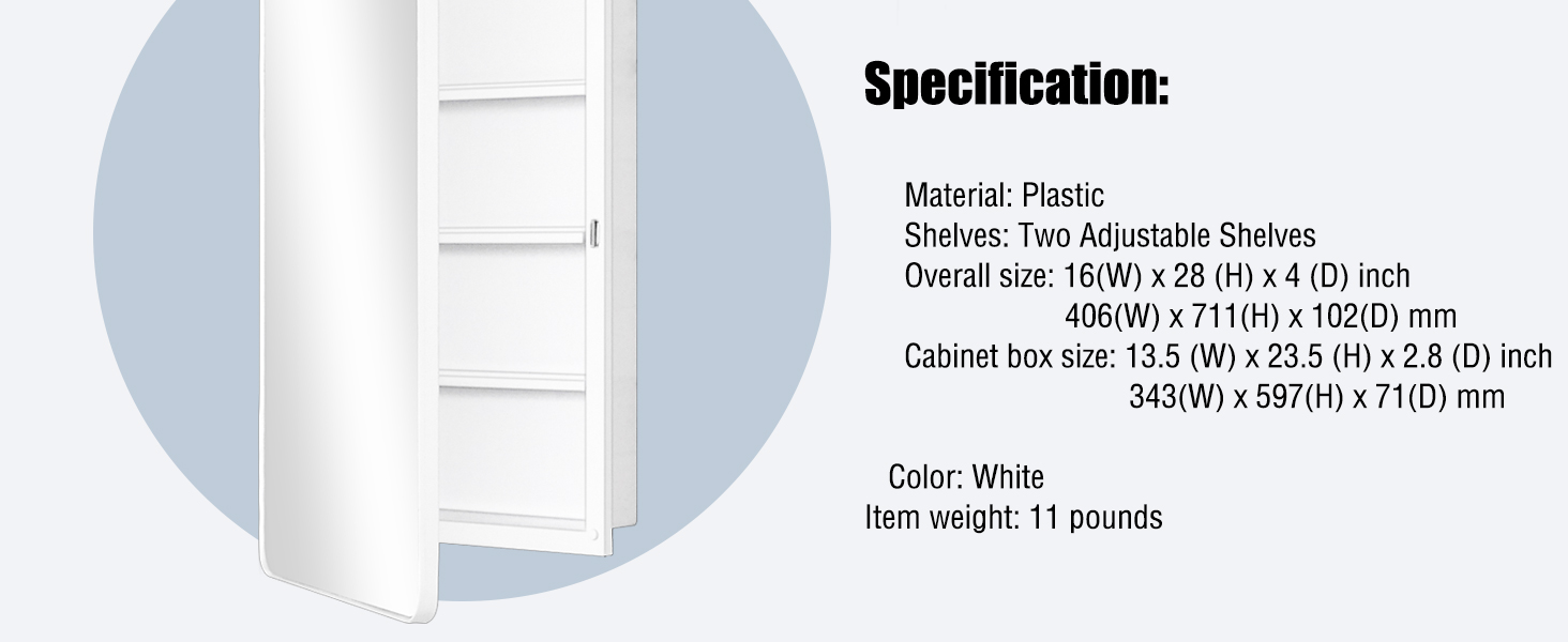 Overall Size: 16 x28 x4.2 inch , 406 x711 x106mm Rough in: 13.5 x23.6 x2.8 inch , 344 x600 x72mm Adjusted shelves: 3pcs