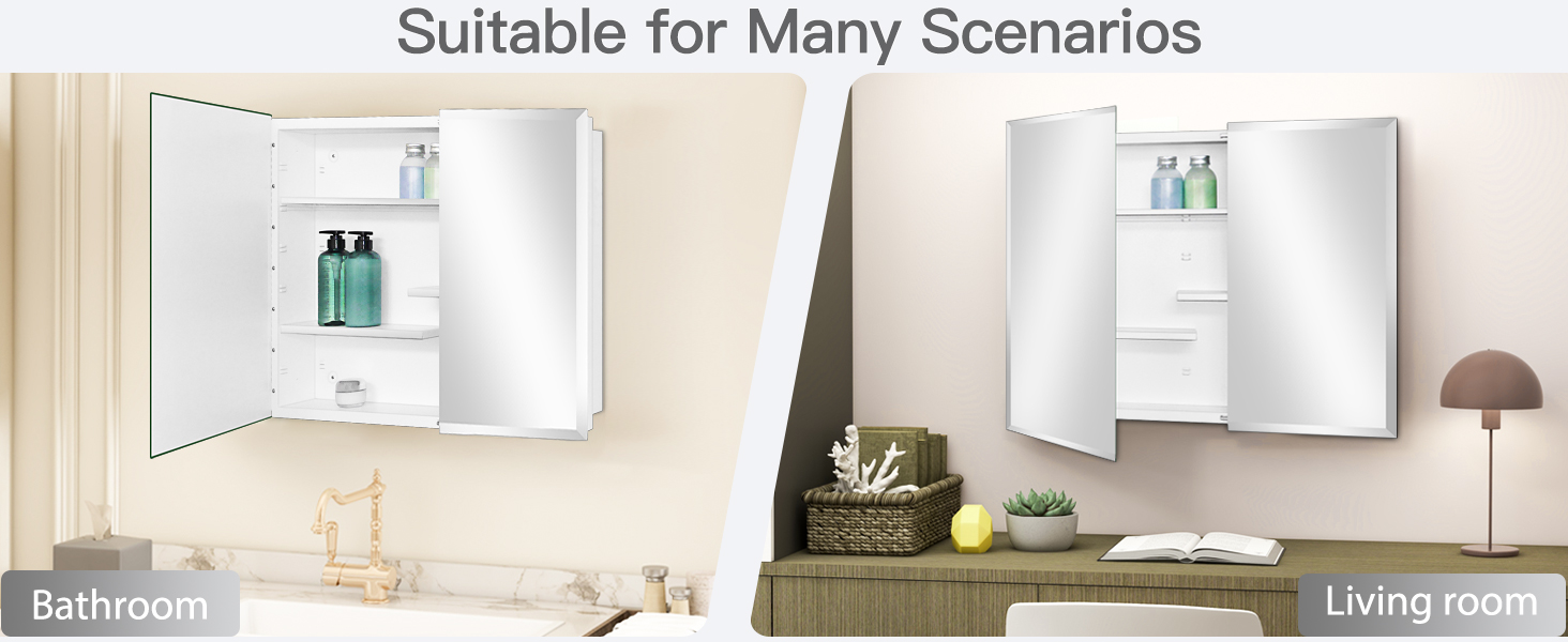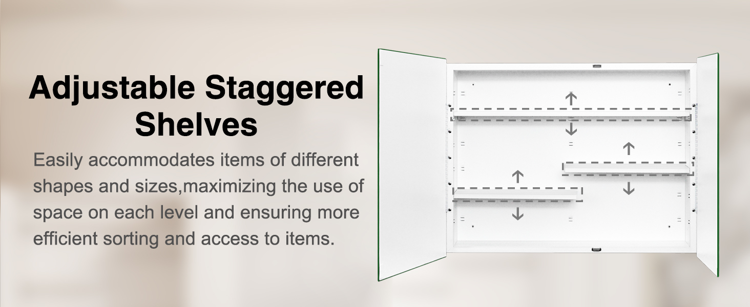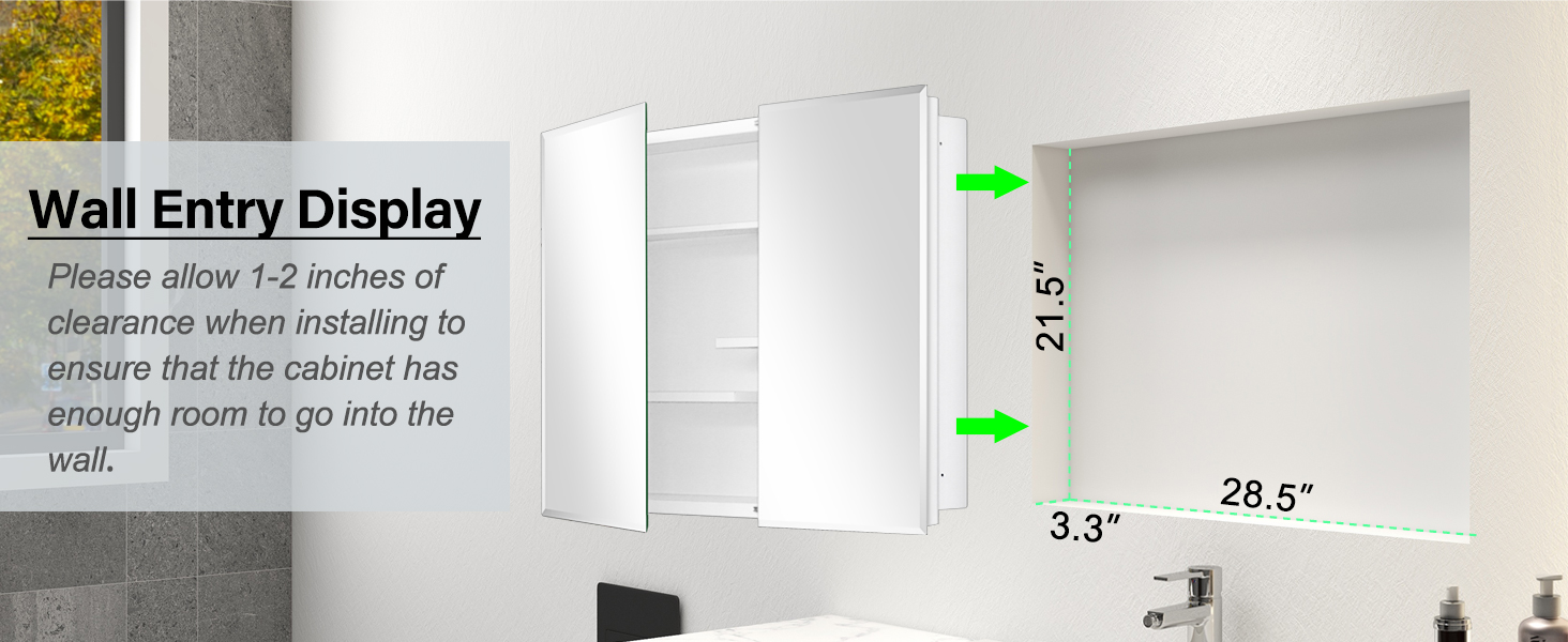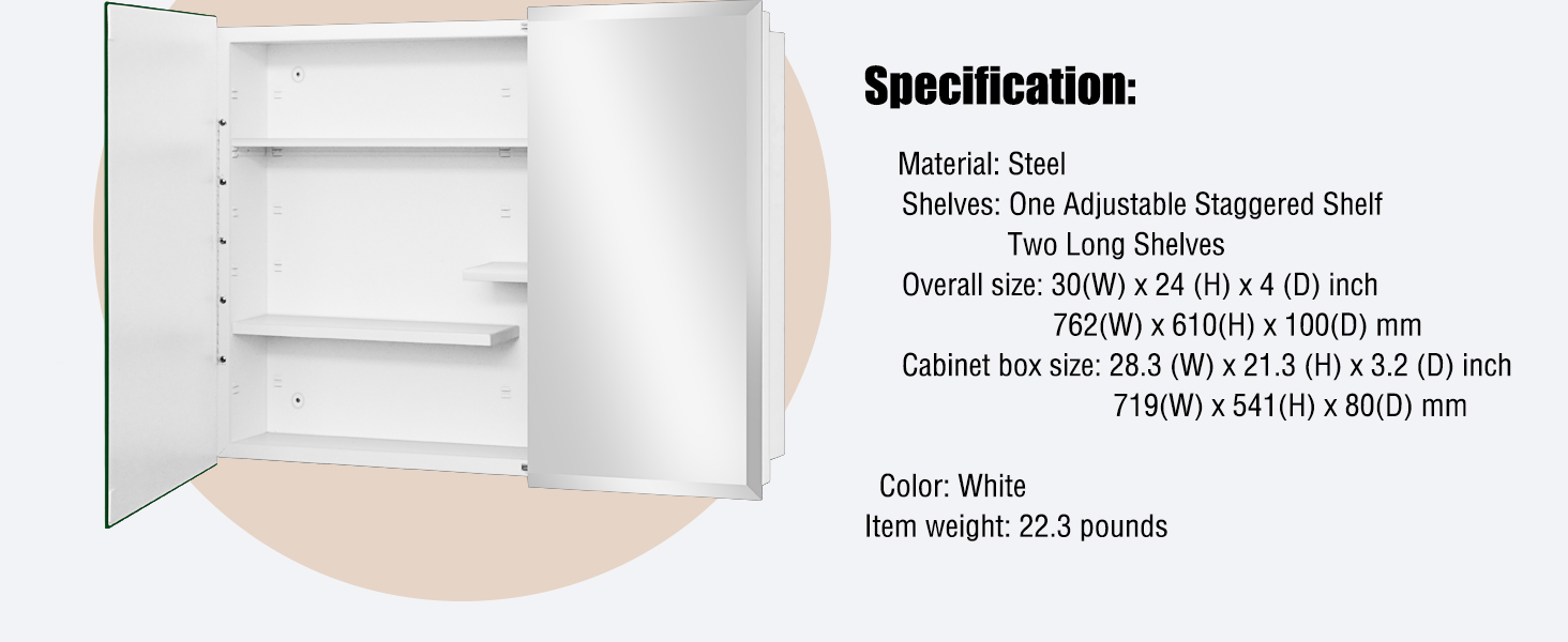 Overall Size: 30 x24 x4.1 inch , 720 x610 x105mm Rough in: 28.3 x21.4 x3.1 inch , 720 x543 x79mm Adjustable Staggered Shelves: 3pcs